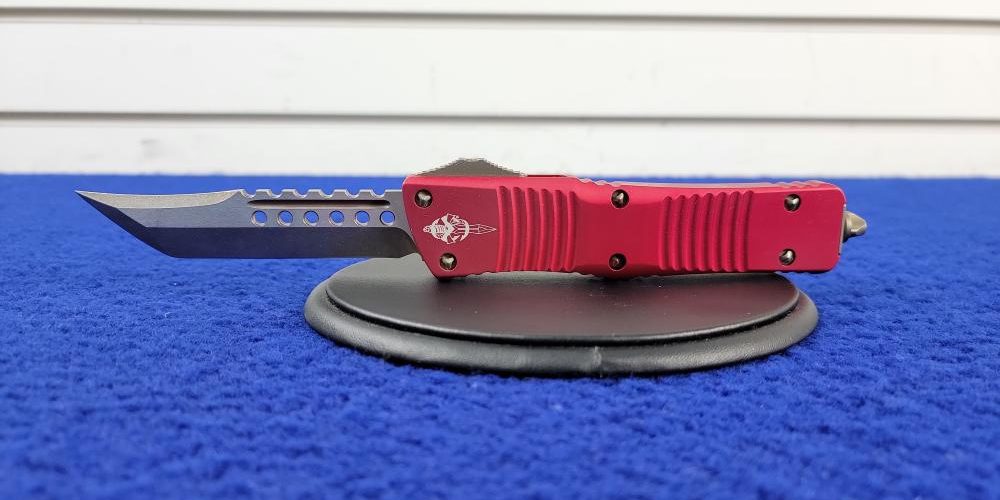 Out of stock almost everywhere, rare and hard to find, Microtech’s Combat Troodon Hellhound Red is a great piece of functioning art. A double action Out the Front (OTF) knife, featuring red anodized 6061-T6 aluminum handle with a 204P steel blade. This amazing knife is in very good shape, save for one point of use on the blade. The Combat Troodon Hellhound is a must have for any serious knife collector, and would make one heck of a nice stocking stuffer for that aficionado of sharp things on your shopping list.